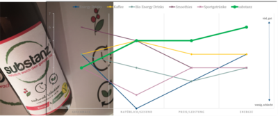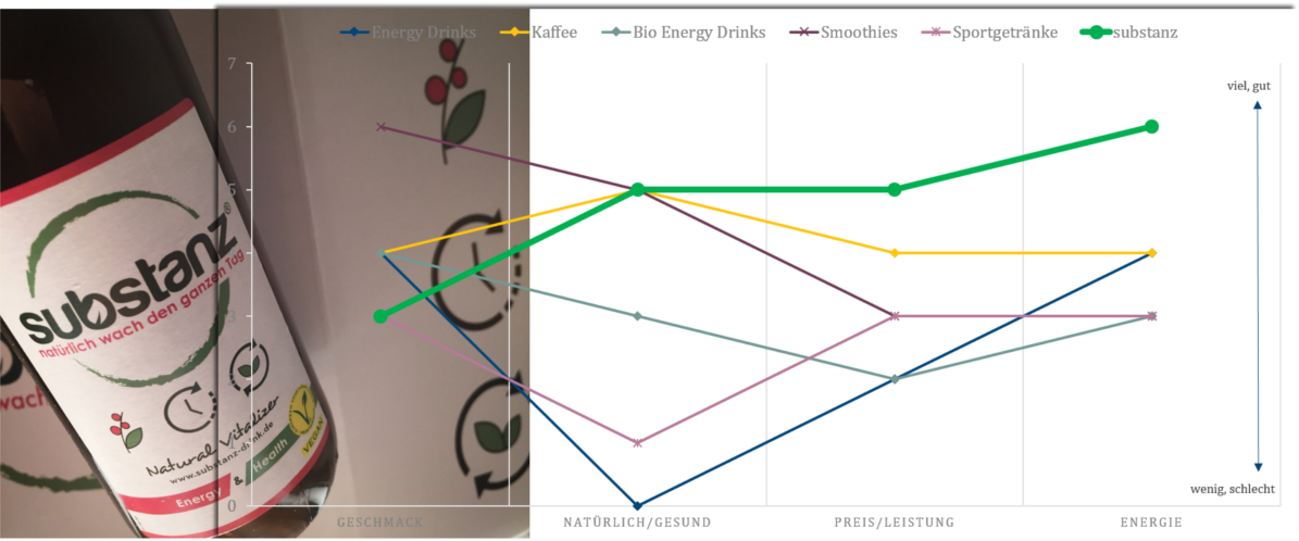 ** Die Grafik erklärt anhand eines Beispiels: Die Eigenschaft „Natürlich/gesund“ sagt aus, dass herkömmliche Energy Drinks auf einer Skala von 0 bis 7 als wenig natürlich und gesund und zum Beispiel Kaffee mit einer Bewertung von 5 als relativ natürlich und gesund eingestuft wird.