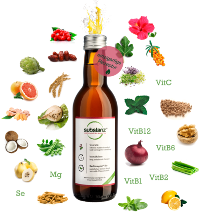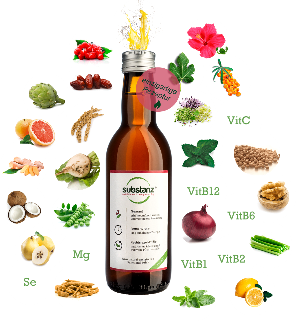 Die Rezeptur besteht aus 30 hochwertigen Inhaltsstoffen, viele davon würde man in einem Getränk nicht unbedingt erwarten. Die Rezeptur bietet neben Natürlichkeit auch eine hochgradig funktionelle Komponente. Wichtige Pfeiler des Funktionsgetränks substanz sind die vegane, natürliche Rezeptur, die zugleich gluten- und laktosefrei ist und ohne Kohlensäure auskommt.